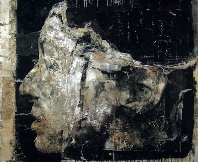 E questa mostra esiste perché da subito affianca a Mattia Moreni, quasi una sfida, un artista vivente, Nicola Samorì, tra i migliori pittori italiani del presente, coinvolgendolo non solo in quanto artista, ma anche come una sorta di co-curatore e compagno di strada con cui si sono qui condivisi studi, scoperte, appassionate ricerche e snodi progettuali ed espositivi con il chiaro intento di restituire un Moreni, se non inedito, sicuramente meno visto e conosciuto; che la scelta delle opere in mostra è qui frutto di una selezione decisamente partigiana e arbitraria, di modi di vedere che, man mano che si sono affinati e addentrati nel trasgressivo labirinto moreniano, hanno finito per tralasciare alcune cose a favore di altri periodi, fasi e singole soluzioni che invece si prestavano meglio alla narrazione che si andava tessendo e alla ricerca di incastri, risonanze ed echi con i fantasmi e le combustioni di Samorì. Ecco allora l’epicità tragica delle angurie, i pallori lunari e la mollezza opalina delle carni insieme al duro e polveroso bianco di ossa e marmi di Samorì, o le lumeggiature impazzite e taglienti come lame e rotaie, le incisioni, slabbrature e ferite, la lascivia decadenza invertebrata dei corpi molluschi come spiaggiati, insieme ai resti accartocciati e schiacciati dalla gravità appartenenti all’altro artista; cera che scioglie e cola in un gialloverde malaticcio, cascami materici e luci livide violette, la pelle liscia levigata pallida e la dissoluzione e scorticazione inferta a questa candida superficie lattiginosa d’alabastro; o ancora la costruzione segnica, furiosa, gestuale e ortogonale delle baracche e legni e cartelli, insieme a teatri effimeri in cui si compongono precari frammenti, fragili architetture da niente fatte di reperti sparsi, rifiuti e accumuli, i notturni e le apparizioni potenti come incubi provenienti dal futuro, la battaglia e incendio dei bianchi e neri che convive sapientemente e con certa sorpresa con inattesi e struggenti passaggi tonali, e i grigi fangosi che dilagano a riprendersi il quadro, stringendo e coprendo sordamente l’immagine, seppellendola in ripensamenti e sconfitte pompeiane; e poi i marroni e i rosa, la carne, fino al volto come mappa e campo di battaglia…
