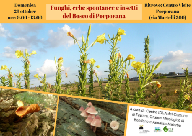 FERRARA – Appuntamento domenica 28 ottobre alle 9 al Centro Visite di Porporana (ex Scuole elementari – via Martelli 300 – di fronte alla chiesa) per una mattinata di scoperta dei funghi, delle erbe spontanee e degli insetti del Bosco di Porporana.