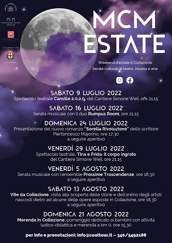 Si parte sabato 9 luglio 2022 alle ore 21.15 con lo spettacolo teatrale Camille 2.0 2.0, del Cantiere Simone Weil, che racconta la storia di Camille che incarna sul palcoscenico l’emblema del femminile, affermando la libertà di esprimersi e di vivere. Non è più solo una Camille artista incompresa, ma una donna come tutte che riscopre attraverso il teatro come la passione è sempre luce e vita. In questa nuova location non usuale, Camille si muove in uno spazio metafisico, sospeso, racconta la sua storia e rivive la sua vita, “muore” per “rinascere, fa della disobbedienza una virtù è il suo grido d’amore finale risveglia le coscienze di tutti noi.