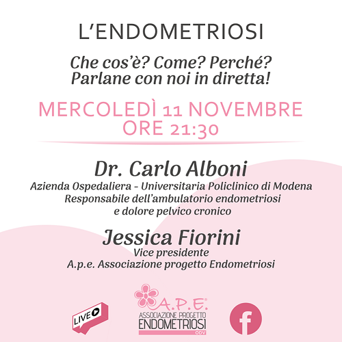 EMILIA ROMAGNA – Comprendere l’endometriosi per facilitarne le cure. Mercoledì 11 novembre 2020, alle 21.30, è l’occasione per conoscere da vicino questa malattia complessa di cui soffrono circa 3 milioni di donne in Italia e per sciogliere ogni dubbio, partecipando all’incontro online organizzato da APE – Associazione Progetto Endometriosi, che mette insieme pazienti di tutta Italia. Si potrà interagire e porre domande in diretta con Carlo Alboni, dottore dell’Azienda Ospedaliera Universitaria del Policlinico di Modena e responsabile dell’ambulatorio endometriosi e dolore pelvico cronico, e con Jessica Fiorini, vicepresidente di APE, Associazione che lavora per creare consapevolezza sulla malattia e per limitare i danni che questa provoca, portando all’attenzione la necessità della diagnosi precoce. Un meeting a cui partecipare sulla pagina Facebook di APE: https://www.facebook.com/ApeOnlus