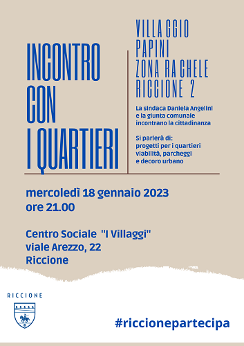 RICCIONE (RN) – Nuova tappa per #riccionepartecipa. Mercoledì 18 gennaio alle 21.00, la sindaca Daniela Angelini e la giunta incontreranno i cittadini del Villaggio Papini e della zona Rachele al Centro di Buon Vicinato in viale Arezzo 22.