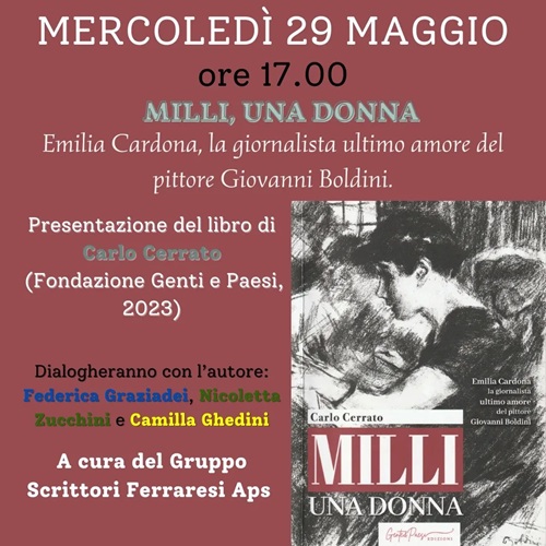 FERRARA – Ripercorre la vita di “Emilia Cardona, la giornalista ultimo amore del pittore Giovanni Boldini” il libro di Carlo Cerrato dal titolo “Milli, una donna” che mercoledì 29 maggio 2024 alle 17 sarà presentato nella sala Agnelli della biblioteca comunale Ariostea (via Scienze 17 Ferrara).