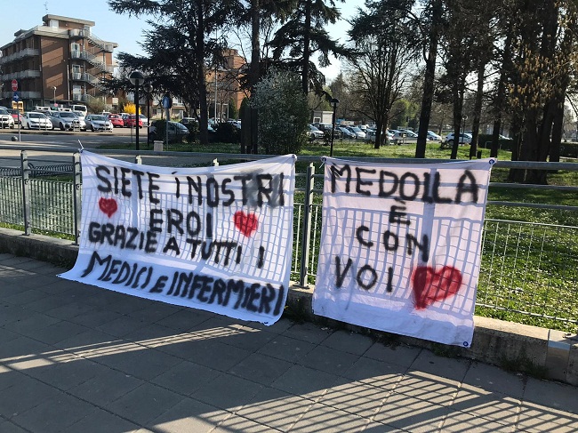 Nelle foto, gli striscioni comparsi questi giorni davanti all’Ospedale: gli operatori ringraziano per il grande sostegno, ricordando al contempo l’importanza di rispettare le misure precauzionali previste.
