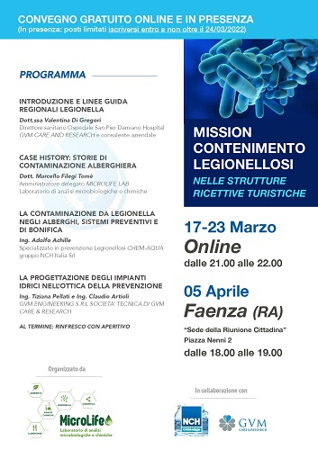 FAENZA (RA) – Martedì 5 aprile alle ore 18 si svolgerà presso la Sede della Riunione Cittadina di Faenza il Convegno gratuito dal titolo “Mission contenimento legionellosi”.