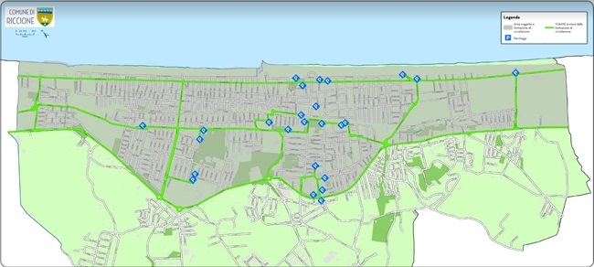 L’area del centro abitato del Comune di Riccione soggetta al divieto di circolazione comprende la zona urbana a mare della Statale 16. Sono esenti dalle limitazioni la Statale 16 stessa e alcuni tratti della viabilità urbana al confine, tra cui viale Torino dal confine con Misano Adriatico, viale Felice Pullè e viale Gabriele d’Annunzio dal confine con Rimini. Inoltre, per consentire l’accesso ai principali parcheggi e alla struttura ospedaliera, sono esclusi i seguenti tratti: viale Vercelli, viale Aosta, viale Luigi Angeloni, viale Portofino, viale Castrocaro, viale Vittorio Emanuele II, viale Luigi Einaudi, viale Ceccarini (nella porzione compresa tra viale Vittorio Emanuele II e viale delle Magnolie), viale delle Magnolie, viale XIX Ottobre (nel tratto tra viale Panoramica e viale Diaz), viale Panoramica (nella sezione tra viale XIX Ottobre e viale Santorre di Santarosa), viale Santorre di Santarosa (nella parte tra viale Panoramica e via Adriatica), viale Giovanni da Verrazzano, viale Milano, viale Frosinone, viale Formia, viale Cervi (nel tratto compreso tra viale Frosinone e viale Formia), viale Ruffini (nel segmento tra viale Cervi e piazza Unità), viale Lazio (nel tratto compreso tra viale Formia e l’accesso al parcheggio della biblioteca), viale Bonderno, viale Cortemaggiore (nella porzione tra viale Bonderno e viale Lungorio), viale Lungorio, viale dei Mille (nel tratto compreso tra viale Lungorio e viale Parini), e viale Catullo (nel tratto compreso tra viale Parini e l’accesso al parcheggio del Palacongressi).