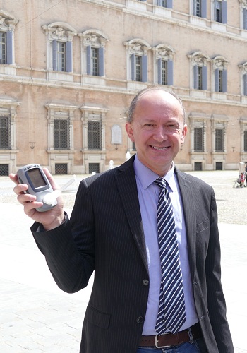 NELLA FOTO: Massimo Bigarelli con il carbossimetro, strumento che misura il monossido di carbonio nell’aria alveolare (nei polmoni), indice del livello di intossicazione da sigarette.