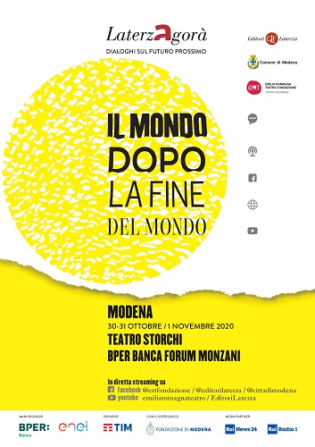 Da venerdì 30 ottobre a domenica 1 novembre al Teatro Storchi e al BPER Banca Forum Monzani di Modena si realizzerà “Laterza Agorà”, un festival del pensiero ideato dagli Editori Laterza, prodotto da Emilia Romagna Teatro Fondazione e Comune di Modena, con il supporto di BPER Banca e Enel, main sponsor dell’iniziativa, di TIM, sponsor, e con il contributo della Fondazione di Modena. Tre giornate di ragionamento con grandi nomi della cultura su come la pandemia sta cambiando il mondo e su come fare per uscire dalla crisi nel modo migliore.