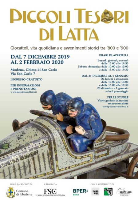 MODENA – Sabato 7 dicembre 2019,alle ore 11.30, sarà inaugurata la mostra “Piccoli Tesori di Latta. Giocattoli, vita quotidiana e avvenimenti storici tra ‘800 e ‘900”, realizzata dall’Associazione Culturale Antichità Svelate all’interno della Chiesa di San Carlo in Via San Carlo a Modena, per far conoscere al pubblico la vasta raccolta di giochi d’epoca del collezionista modenese Marco Zanasi.