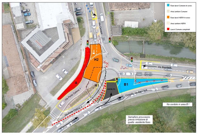 L’accensione dei semafori regolerà il transito in tutte le fasi degli interventi di Hera e Comune, sino al completamento della realizzazione dell’anello definitivo della nuova rotatoria.