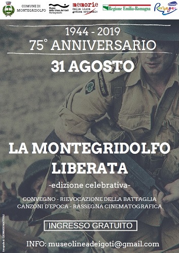 In occasione del 75° Anniversario della Liberazione di Montegridolfo l’Amministrazione Comunale ha prodotto un vero e proprio calendario di iniziative commemorative, che contemplano la mostra Una luce sulla storia. Un inedito San Sebastiano del Seicento racconta la guerra e le distruzioni del patrimonio culturale e artistico, delle conferenze, delle proiezioni di films e nella giornata del 31 agosto al pomeriggio, un convegno con la rievocazione storica della battaglia e alla sera un concerto con canzoni popolari dell’epoca.