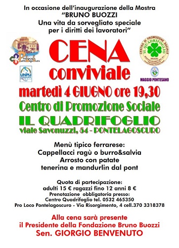 FERRARA – Martedì 4 giugno 2019 alle 17 in piazza Buozzi a Pontelagoscuro (Ferrara) si svolgerà la cerimonia di inaugurazione della mostra “Bruno Buozzi 1944-2019. Una vita da sorvegliato speciale per i diritti dei lavoratori” allestita alla Sala Nemesio Orsatti (via Risorgimento 4, a Pontelagoscuro di Ferrara). Saranno presenti il Presidente della Fondazione Bruno Buozzi, Sen. Giorgio Benvenuto e il vicesindaco di Ferrara Massimo Maisto. Alla cerimonia alcune ragazze e ragazzi della classe terza C della scuola media statale “I.C. Tura” di Pontelagoscuro leggeranno brani tratti dalla corrispondenza intercorsa tra Buozzi e la moglie Rina durante l’esilio a Parigi e la prigionia in carcere. Dopo l’inaugurazione, alle 19.30, è in programma una cena conviviale al centro di promozione sociale Il Quadrifoglio, alla quale parteciperà anche l’Arcivescovo di Ferrara, monsignor Angelo Perego.
