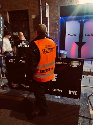 Nella foto in alto street tutor davanti alla discoteca College a Ferrara. Scaricabili in fondo alla pagina, le aree presidiate durante la movida in centro storico, tra piazza Verdi-Carlo Mayr-San Romano