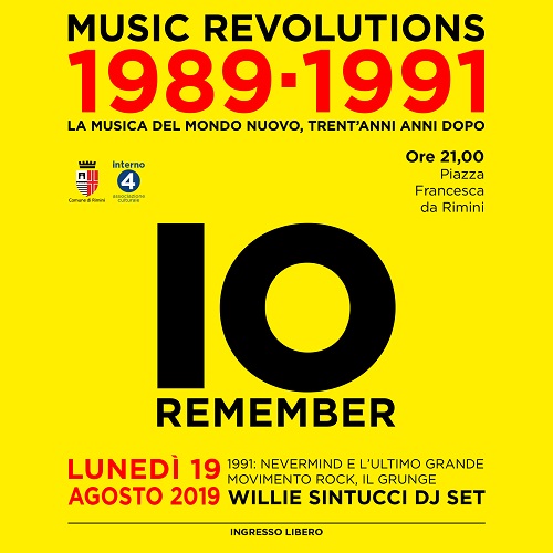 RIMINI – L’avvento del rap, l’evoluzione della musica elettronica e per finire l’esplosione dell’ultimo movimento rock, il grunge, assieme ad uno dei protagonisti della scena musicale riminese degli anni ’90, un personaggio che ha fatto ballare generazioni di ragazzi. Willie Sintucci, per anni direttore artistico dell’Io Street club, torna in consolle lunedì 19 agosto (dalle ore 21) per il terzo e ultimo appuntamento di Music Revolutions 1989-1991, la mini-rassegna organizzata da Comune di Rimini e da Associazione Culturale Interno4 per celebrare la “musica del mondo nuovo a trent’anni dalla caduta del Muro di Berlino”. Dopo Frankie hi-nrg mc e Alioscia (Casino Royale), l’arena di piazza Francesca da Rimini ai piedi di Castel Sismondo si prepara ad una serata speciale e difficilmente ripetibile: IO Remember durante la quale si celebrerà il 1991, il Grunge e l’uscita di Nevermind dei Nirvana.
