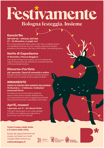 BOLOGNA – Per vivere insieme il periodo delle feste all’insegna della cultura, dell’arte e della socialità arriva Festivamente, il cartellone di iniziative culturali promosso e coordinato dal Comune di Bologna | Settore Cultura e Creatività.