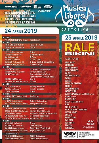 Il 25 aprile, invece, sarà il giorno dell’evento Ralf in Bikini, una no-stop musicale di 12 ore che farà ballare migliaia di persone da mezzogiorno a mezzanotte. “Si annunciano sorprese con uno staff che è al lavoro per preparare qualcosa di unico e memorabile e per prepararci al prossimo anno vista la ricorrenza del decennale di Ralf in Bikini” ha aggiunto Mauro Bianchi tra gli organizzatori di “Musica Libera”. Proprio quest’ultimo ha lanciato il proprio invito a “godersi per due giorni Cattolica con i suoi ritmi e sonorità. Sarà una manifestazione unica nel suo genere alla quale è impossibile mancare”.