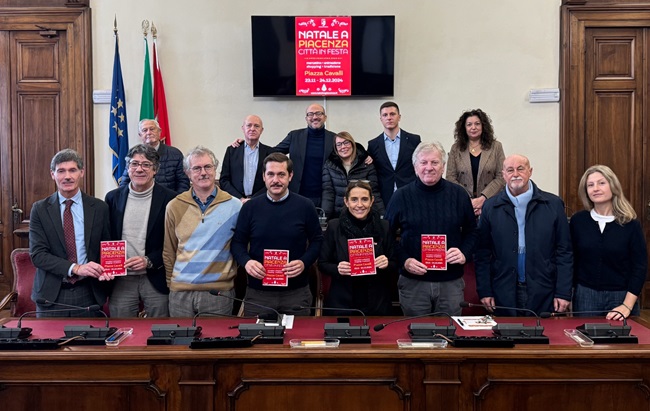 PIACENZA – Martedì 19 novembre 2024 si è svolta in Municipio la conferenza stampa di presentazione della brochure “Natale a Piacenza” che comprende tutte le iniziative del periodo natalizio: il tradizionale mercatino che animerà piazza Cavalli dal 23 novembre – data di accensione dell’albero di Natale e del tappeto di luci donati da Confindustria – e le animazioni in programma tra gli allestimenti del villaggio a tema, dedicate innanzitutto a bambini e famiglie, senza dimenticare – nell’ambito delle attività affidate alla ditta Mark.Co & Co., realizzate con il sostegno di Iren, Emilbanca e Concessionaria Bossoni – il trenino gratuito a disposizione nei fine settimana e la solidarietà con le “casette” delle associazioni di volontariato in piazzale Plebiscito, dove per i più piccoli sarà presente ogni giorno anche una giostra.