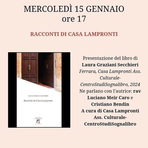 FERRARA – È dedicato alla figura del rabbino ferrarese Isacco Lampronti e alla sua abitazione di famiglia il libro di Laura Graziani Secchieri “Racconti di Casa Lampronti”, che mercoledì 15 gennaio 2025 alle 17 sarà presentato nella sala Agnelli della biblioteca comunale Ariostea (via Scienze 17, Ferrara). Ne parleranno con l’autrice: rav Luciano Meir Caro e Cristiano Bendin.