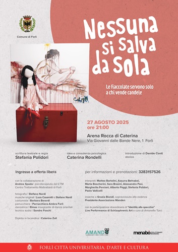 Mercoledì 27 agosto ore 21.00, l’Associazione Amando porta in scena all’Arena Rocca di Caterina lo spettacolo teatrale “Nessuno si salva da sola”, da un’idea di Caterina Rondelli, scritto e diretto da Stefania Polidori e nato grazie alla collaborazione ed al sostegno del Lions Club Forlì Host.