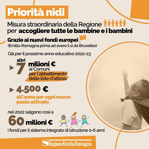 La Giunta Bonaccini è ora nelle condizioni di accelerare rispetto ad uno degli obiettivi più qualificanti del programma di legislatura: trasformare i servizi per l’infanzia in servizi universali, abbattendo progressivamente sia le liste d’attesa che le tariffe a carico delle famiglie, per accogliere entro il 2025 tutte le bambine e i bambini, dando così risposta a ogni famiglia.