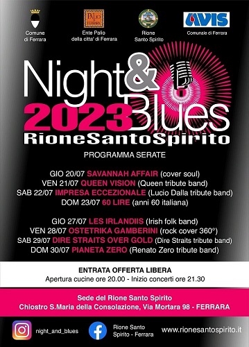 “Night & Blues – ha dichiarato l’assessore Matteo Fornasini – è una tradizionale e consolidata manifestazione che offre la possibilità al Rione di Santo Spirito e alla città di Ferrara di far conoscere anche ai turisti un luogo meraviglioso come il chiostro di Santa Maria della Consolazione. Ringrazio il Rione e tutte le contradaiole e i contradaioli per il grande impegno che dedicano all’organizzazione di questa bella manifestazione, anche perché in questi anni, al netto della pandemia, è diventato sempre più complesso organizzare eventi di questo tipo. Se Santo Spirito lo riesce a fare, così come altre contrade per altre manifestazioni, significa che alla base c’è un gruppo di volontari che sono diventati nel corso degli anni dei professionisti degli eventi, riuscendo a organizzare manifestazioni di alto livello. Il programma è ricchissimo e rappresenta anche quest’anno uno degli appuntamenti musicali estivi che più caratterizzano la nostra città. Il Comune sosterrà la manifestazione e il Rione con il proprio patrocinio oltre che con un contributo economico”.