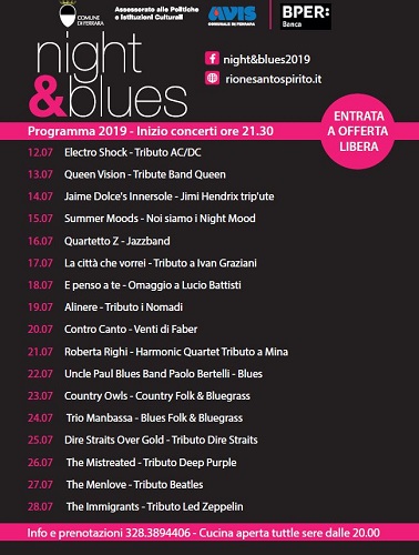 “Night&blues – ha ricordato Matteo Cristofori – è un evento musicale nato nel 2003 con l’intento di far conoscere la realtà della contrada di Santo Spirito e il bellissimo chiostro nel quale ha sede. Negli anni la manifestazione si è evoluta grazie all’impegno di tanti membri e sostenitori della contrada oltre che al supporto storico del Comune, riconfermato anche dalla nuova Giunta. Per questa edizione la direzione artistica composta, oltre che da me, da Gabriele Mantovani, Michele Zaniboni, Lauro Luppi, Michele Marchesini e Paolo Bertelli, ha composto un programma di diciassette serate musicali, tra blues, jazz e tributi a gruppi che hanno fatto la storia della musica mondiale. Ad arricchire le serate ci saranno poi le famose cucine del Rione che proporranno specialità gastronomiche per tutti i gusti”.
