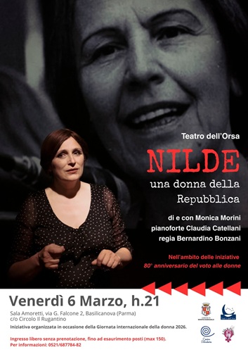 MONTECHIARUGOLO (PR) – «Continuo a guardare alla politica come alla più alta delle eredità. La vivo oggi con lo stesso impegno e con lo stesso entusiasmo di quando ho incominciato. Credo nella politica come strumento indispensabile per cambiare la società e per diffondere nuove idee»: Monica Morini cita Nilde Iotti per introdurre Nilde: una donna della Repubblica, storico spettacolo del Teatro dell’Orsa che venerdì 6 marzo alle ore 21 sarà presentato alla Sala Amoretti di Basilicanova, in provincia di Parma, nell’ambito delle iniziative per l’ottantesimo anniversario del voto alle donne.
