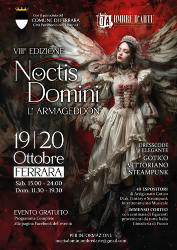 Dopo il successo delle scorse edizioni, in particolar modo dello scorso 2023, per la prima volta l’evento passa alla durata di due giorni. Si parte sabato 19 ottobre dalle ore 15.00 con l’apertura in Piazza Trento Trieste dell’area artigianato per gli amanti del gotico e dello steampunk, con artigiani che arrivano da tutta Italia e per la prima volta anche dall’Estero. Sempre dalle ore 15.00 alle ore 15.45 con il tour “Ferrara Magica” vi porteremo in giro per la città, preferibilmente in costume per rendere più suggestiva la visita, raccontandovi le storie e le leggende che rendono questo piccolo gioiellino emiliano ancora più affascinante e misterioso. Per partecipare alla visita è obbligatoria la prenotazione alla mail noctisdominiombredarte@gmail.com (fino ad esaurimento posti). Ci saranno inoltre esibizioni musicali con la presenza durante la giornata di sabato di Katija Di Giulio, rock metal violinist, dalle 16.00 alle 18.00, e dei Daridel Pagan Folk, gruppo ben conosciuto in Italia, ma molto apprezzato anche all’Estero, che si esibirà alle 19.30 e ci accompagnerà con la sua musica durante l’immenso corteo serale, che vedrà i Signori della Notte scontrarsi contro i cacciatori di demoni, pronti a difendere fino all’ultimo respiro Ferrara, quest’anno protetti anche da imponenti angeli. Una delle presenze che maggiormente siamo felici e onorati di poter annunciare è quella di Nicola Mari, ferrarese di nascita, fumettista della Sergio Bonelli Editore e attualmente una delle colonne portanti dell’indagatore dell’incubo più conosciuto d’Italia: Dylan Dog. Nicola Mari sarà presente sabato 19 ottobre dalle 18.00 alle 20.00 in Piazza Trento Trieste per sketch e autografi. Sempre durante la giornata saranno presenti i ragazzi di Omnia Larp, una delle collaborazioni di quest’anno, per coinvolgervi maggiormente fra indizi e missioni, oltre al corteo Cacciatori e Angeli, con partenza da Piazza Trento Trieste alle 18.30. Dalle 21.00, sempre in Piazza Trento Trieste, ci ritroveremo per cominciare a radunare tutte le creature della notte, aprendo il corteo con uno spettacolo di Gionata Feuer Frei Psicomagik Fireshow, artista con alle spalle collaborazioni importanti come quella con i Placebo e che vi incanterà con le sue esibizioni. Partiremo quindi con centinaia di figuranti per il centro storico, tra interpretazione e scontri che vedranno i Signori della Notte affrontare i difensori di Ferrara, quest’anno spalleggiati da imponenti angeli. A Ferrara sta per arrivare l’Armageddon, starà a voi decidere da che parte stare: luce e ombra sono l’eterna battaglia che ogni giorno affrontiamo, portata in scena ogni anno durante il Noctis Domini, che vede i partecipanti portare bellissimi abiti che rispettano il dresscode richiesto dall’organizzazione: gotico elegante, vittoriano e steampunk, ricordando che non è un evento di Halloween, ma un evento per gli appassionati del gotico e dello steampunk, pertanto sono rigorosamente vietati zombie o personaggi non in linea con l’evento; in linea con il Noctis Domini sono invece vampiri, licantropi, streghe e stregoni, demoni, mietitori, medici della peste, banshee. Potrete partecipare anche da spettatori, possibilmente in abbigliamento scuro e, se vorrete illuminare Ferrara e contrastare le Ombre, portare con voi una candela led o una lanterna (sempre led, ci raccomandiamo di non usare fiamme vive), che vi chiederemo di accendere a fine serata durante lo spettacolo finale. A tal proposito, l’artigiana Cagliostrino, molto conosciuta ed apprezzata in Italia, renderà disponibili alcune sue piccole creazioni luminose appositamente per partecipare al corteo, così da portare a casa un piccolo pezzo di artigianato e far parte attiva della serata, illuminando Ferrara di Luce e facendo la vostra parte nel contrastare l’Ombra.