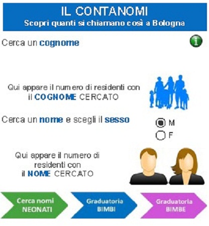 BOLOGNA – Sofia per le bimbe, Alessandro e Lorenzo a pari merito per i maschietti: sono questi i nomi più gettonati scelti dai neo genitori dei piccoli nati nel 2016 a Bologna. Ma il primato dei nomi più diffusi in città rimane incontrastato: Andrea (sul podio dal 2005) e Maria. Se invece curiosiamo tra i cognomi, al primo posto ritroviamo il signor Rossi, ma la sorpresa è nella top 20: in diciottesima posizione sale infatti il cognome straniero Hossain. Tra i primi cento cognomi più diffusi, quelli stranieri sono otto. La fotografia dei nomi e cognomi dei bolognesi, aggiornata a fine 2016, è stata scattata dall’Ufficio di Statistica del Comune di Bologna che da MERCOLEDì offre a tutti on line su Iperbole uno strumento per soddisfare le curiosità su come si chiamano i residenti in città, quante volte compare lo stesso cognome, quanti neonati si chiamano nello stesso modo, come cambiano i nostri nomi nel corso degli anni. Il pratico calcolatore si può utilizzare cliccando l’indirizzo della home page della sezione “I numeri di Bologna”.