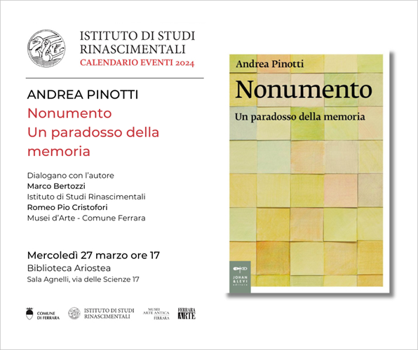 FERRARA – Nell’ambito del ciclo “Una Costellazione di libri. Letture e conversazioni dell’Istituto di Studi Rinascimentali”, mercoledì 27 marzo 2024, alle 17, la sala Agnelli della biblioteca comunale Ariostea (via Scienze 17, Ferrara) ospiterà la presentazione del libro di Andrea Pinotti “Nonumento. Un paradosso della memoria” (Johan & Levi, 2023). Dialogheranno con l’autore: Marco Bertozzi (Istituto di Studi Rinascimentali) e Romeo Pio Cristofori (Servizio Musei d’Arte, Comune di Ferrara).