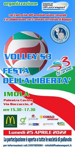 Sempre l’A.S. DIFFUSIONE SPORT di Imola, poi, organizza, il prossimo 25 aprile 2022, la manifestazione di Volley S3 “TROFEO DELLA LIBERTÀ”. L’evento si svolgerà a Imola, dalle ore 15.30, presso la Palestra Cavina di via Boccaccio e le iscrizioni potranno essere effettuate entro il 23 aprile inviando una e-mail a info@diffusionesport.it oppure telefonando al numero 3397005081 (Pasquale De Simone). Alla manifestazione sono previste tre categorie: S3 White per gli anni 2014,2015 e 2016, S3 Green per gli anni 2012, 2013 e 2014, S3 Red per gli anni 2010, 2011 e 2012. Il costo per l’iscrizione è di 10 euro a squadra.