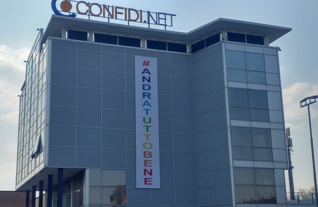 RIMINI – Sulla facciata della sede riminese di CONFIDI.NET campeggia da qualche giorno la scritta “#ANDRÀ TUTTO BENE”. Il motto che accompagna gli italiani dall’inizio dell’emergenza sanitaria vuole essere uno stimolo e un incoraggiamento per tutti: per chi combatte in prima linea come i malati e gli operatori sanitari, ma anche per le tantissime piccole e medie imprese del territorio che, costrette a chiudere le proprie attività per limitare i contagi da Covid-19, si stanno ritrovando in grande difficoltà economica.