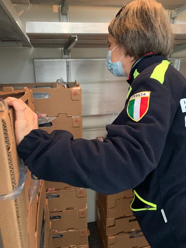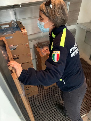 foto dell’assessore Montini mentre ripone la donazione nella cella frigorifera della Protezione civile
