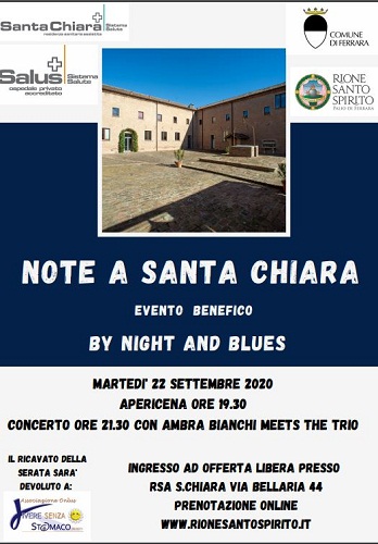 FERRARA – Metterà insieme buona musica e beneficenza l’appuntamento con “Note a Santa Chiara – by Night and Blues”, in programma martedì 22 settembre alle 19.30 al chiostro della Rsa Santa Chiara, attiva nell’ex convento di Santa Chiara (via Bellaria 44). Aperto al pubblico per l’occasione da Salus, lo spazio accoglierà i partecipanti con un apericena e successivamente (alle 21.30) con un concerto dei gruppo Ambra Bianchi Meets the Trio.