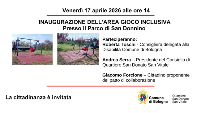 BOLOGNA – Venerdì 17 aprile alle 14, verrà inaugurata un’area giochi inclusiva nel parco San Donnino in via San Donato 143. Si tratta del risultato di un patto di collaborazione tra il quartiere San Donato-San Vitale e la cittadinanza.