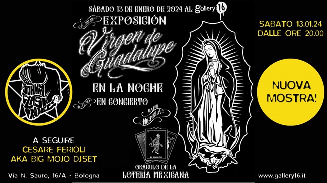 BOLOGNA – Gallery16 è lo shop di dischi, libri e il cocktail bar che vi aspetta con una programmazione sempre ricca di eventi live, presentazioni, djset e molto altro.Sabato 13 gennaio inauguriamo una nuova mostra, in collaborazione con Diego Borghi: Virgen de Guadalupe – Sacro Profano e Kitsch.