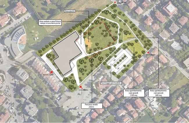 Il progetto però non si limita alla sola struttura, ma comprende un’attenzione al contesto urbano in cui la piscina andrà a funzionare, rafforzando la propria vocazione a luogo di incontro, svago e attività fisica in piena sicurezza. L’ampia area a verde infatti sarà oggetto di un progetto di riqualificazione e implementazione rispetto al parco attuale, valorizzando il parco nella sua interezza. Nello specifico si prevede un percorso ciclopedonale ad anello che collegherà le diverse funzioni presenti nel parco, l’inserimento di un’area gioco attrezzata per i più piccoli, una zona di ‘sosta’ dotata di sedute, un’area dedicata al fitness che dialogherà con l’interno della piscina. E ancora sono previste due aree di sgambamento cani (contro la sola area presente attualmente) e, a servizio degli utenti della piscina e dei cittadini, sarà a disposizione un parcheggio permeabile, quindi realizzato per essere funzionale, restando sostenibile, ‘green’ e integrati nell’ambiente circostante.