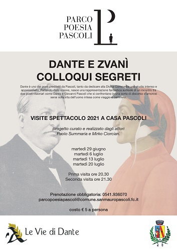 SAN MAURO PASCOLI (FC) – In occasione dell’Anno Dantesco, il Museo Casa Pascoli e il Teatro degli Scartafacci presentano “Dante e Zvanì. Colloqui segreti”: un percorso spettacolarizzato nelle antiche sale della casa natale di Giovanni Pascoli per ripercorrere l’intensa passione di Zvanì per l’opera dantesca e il legame, oltre il tempo, tra i due poeti. Partendo dalla visione, nasce una rappresentazione fantastica surreale di un incontro tra due poeti visionari come Dante e Pascoli che si confrontano in una sorta di discorso d’amorosi sensi sulla vita dell’uomo intesa come viaggio e cammino.