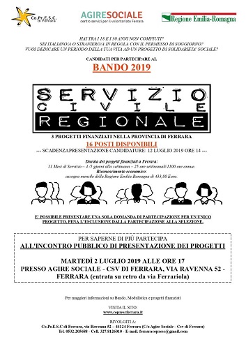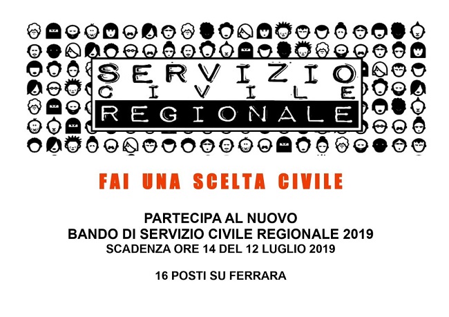 LA SCHEDA a cura degli organizzatori – Entro venerdì 12 luglio 2019 alle 14 è possibile inviare le domande per partecipare al Bando Servizio Civile Regionale 2019 della Regione Emilia Romagna per la selezione di 16 volontari italiani e stranieri da impiegare in progetti di Servizio Civile Regionale nella Provincia di Ferrara.