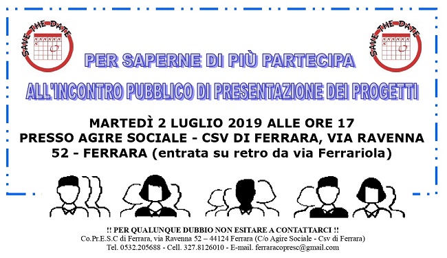 Per informazioni: COordinamento PRovinciale degli Enti di Servizio Civile, via Ravenna 52, Ferrara c/o Agire Sociale-CSV di Ferrara, tel. 0532. 205688, cell. 327 8126010, email ferraracopresc@gmail.com, sito internet http://coprescferrara.it/, pagina FB: https://www.facebook.com/coprescfe/.