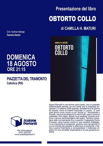 CATTOLICA (RN) – Si terrà domenica 18 agosto alle ore 21,15 presso la Piazzetta del Tramonto di Cattolica la presentazione di “Obtorto collo”, noir d’esordio di Camilla H. Maturi pubblicato dalla casa editrice Scatole Parlanti (collana Voci, pp. 158, euro 14). Dialogherà con l’autrice Daniela Bartoli.