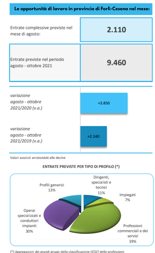 FORLÌ-CESENA – RIMINI – Le previsioni occupazionali in Romagna: nel trimestre agosto-ottobre 2021 le imprese hanno programmato complessivamente 18.960 nuovi ingressi nelle province di Forlì-Cesena e Rimini, di cui 4.500 nel solo mese di agosto.