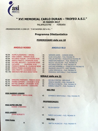 “Il Memorial Duran – ha ricordato l’assessore Merli – è da sempre una vetrina di grande rilevanza nazionale per il mondo del pugilato, un evento dal quale sono emerse figure di rilievo per questo sport. Agli organizzatori va come sempre il ringraziamento dell’Amministrazione comunale per il grande impegno, anche economico, che l’allestimento di una manifestazione come questa richiede”.