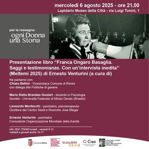 RIMINI – Mercoledì 6 agosto – ore 21 al Lapidario Museo della Città – torna la rassegna “Ogni donna, una storia”, con la presentazione del libro “Franca Ongaro Basaglia. Saggi e testimonianze. Con un’intervista inedita” curato da Ernesto Venturini ed edito da Meltemi.All’incontro parteciperà il curatore Ernesto Venturini, la vicesindaca di Rimini Chiara Bellini, Maria Stella Brandao Goulart – docente di psicologia sociale all’Università federale di Minas Gerais, in Brasile – e Leonardo Montecchi, psichiatra e psicoterapeuta, direttore del Centro studi e ricerche Jose Bleger. La rassegna, curata da Rete Donne Rimini e Casa delle donne del Comune di Rimini, mira a valorizzare le storie di donne che hanno contribuito alla società, come nel caso di Franca Ongaro Basaglia, figura chiave nella riforma della salute mentale, spesso oscurata come “moglie di Basaglia”