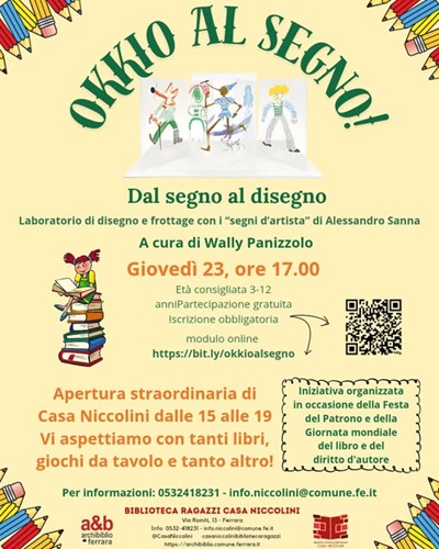 FERRARA – Appuntamento giovedì 23 aprile 2026 alle 17:00 alla biblioteca comunale Casa Niccolini (via Romiti 13, Ferrara), per bambini e ragazzi dai 3 ai 12 anni, con “Okkio al segno”, laboratorio di disegno e frottage con i ‘segni d’artista’ di Alessandro Sanna. L’iniziativa è organizzata in occasione della festa del Patrono di Ferrara e della Giornata mondiale del Libro e del diritto d’autore, ed è a cura di Wally Panizzolo, bibliotecaria di Casa Niccolini.