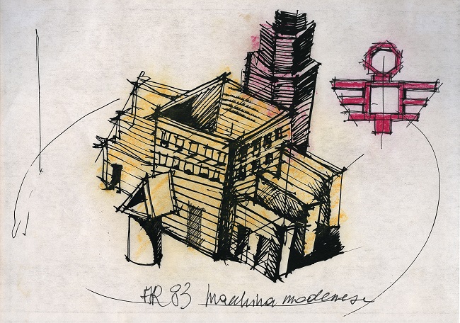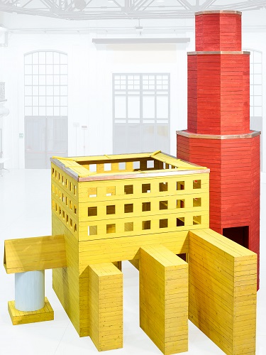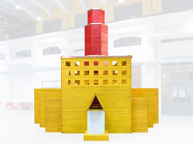 In occasione di quella mostra, che presentava un nucleo centrale di disegni, oli e acquarelli sul Nuovo Cimitero di San Cataldo, concorso vinto da Aldo Rossi e Gianni Braghieri nel 1971, prese corpo all’interno della cupola seicentesca della Palazzina, una costruzione realizzata per volontà dello stesso Aldo Rossi in legname da cantiere dipinto, che potesse restituire in modo chiaro il significato della sua architettura. L’opera del grande architetto creata per l’occasione, probabilmente l’unica sua “effimera” conservata, è ora riproposta dopo un intervento di manutenzione, insieme a una gigantografia del disegno che servì per impostarne la costruzione, conservato nella Raccolta del disegno contemporaneo della Galleria Civica di Modena, oggi in Fondazione Modena Arti Visive.