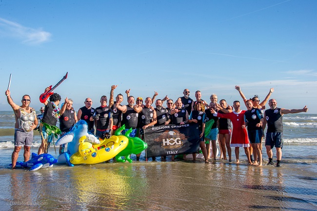 Più di 50 gli harleysti di Riccione Chapter, arrivati in piazzale Roma rigorosamente in sella ai loro bolidi, ma con accappatoio rosso e maxi-gonfiabili di ogni tipo.