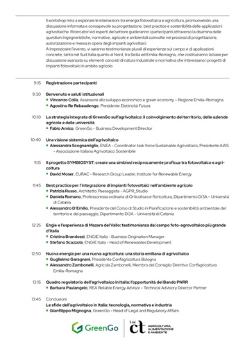 Il programma include relatori di alto profilo quali Agostino Re Rebaudengo, Presidente di Elettricità Futura, Alessandra Scognamiglio, dell’ENEA e presidente dell’AIAS Associazione Italiana Agrivoltaico Sostenibile, Fabio Amico, Business Development Director di GreenGo, che illustrerà la strategia integrata dell’azienda sull’agrivoltaico, David Moser di EURAC, Patrizia Russo, architetto e paesaggista, la Professoressa Romano e il Professor D’Emilio dell’Università di Catania, oltre a Stefano Scazzola e Cristina Brandozzi, rispettivamente Head of Renewables Development e Business Origination Manager ENGIE Italia, nonché Guglielmo Garagnani, Presidente Confagricoltura Bologna.