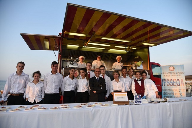 FORLIMPOPOLI (FC) – Oltre 70 studenti dei corsi di sala e cucina, in sei eventi tra luoghi di mare (Cesenatico e Milano Marittima) e città dell’Emilia-Romagna (Ferrara, Imola, Bologna a Fico e Unioncamere). Estate didattica e intesa per i giovani allievi dell’Istituto alberghiero Pellegrino Artusi di Forlimpopoli, protagonisti del road show di Tramonto DiVino, il tour del gusto promosso dalla Regione Emilia Romagna per promuovere i prodotti Dop e Igp regionali. Gli studenti hanno preso parte a sei delle dieci tappe in giro per la regione, imparando sul campo l’utilizzo dei prodotti tipici certificati, le pratiche di servizio, il lavoro di sostegno agli chef nel corso degli show cooking.