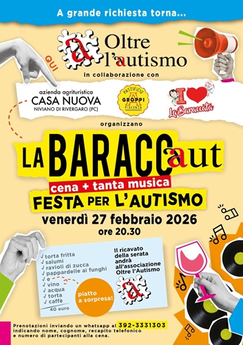 PIACENZA – Si è svolta il 20 febbraio in Municipio la conferenza stampa di presentazione della prossima iniziativa a sostegno dell’associazione Oltre l’Autismo, l’ormai tradizionale appuntamento con la cena benefica “BaraccAut”, in programma venerdì 27 febbraio alle ore 20.30 presso l’azienda agrituristica Casa Nuova di Niviano di Rivergaro. Nell’occasione, è stato anche annunciato l’esito – pari a 51mila e 700 euro – della raccolta fondi natalizia realizzata grazie al dono solidale della “Capsa Alberoniana”.