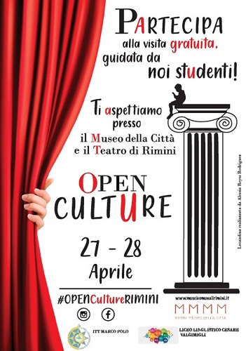 RIMINI – Open Culture è l’evento che i Musei Comunali di Rimini con l’Istituto Tecnico Statale per il Turismo “Marco Polo” e il Liceo Linguistico “G. Cesare-M.Valgimigli” propongono sabato 27 e domenica 28 aprile a coronamento di progetti di Alternanza Scuola Lavoro dell’anno scolastico 2018-19 che hanno coinvolto i ragazzi nella conoscenza diretta dei luoghi della cultura di Rimini e nella progettazione di un evento per la cittadinanza.